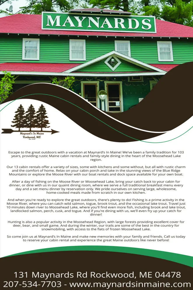 Are you ready for an unforgettable adventure in the heart of Maine's great outdoors? Look no further than Maynard's In Maine! For over 100 years, we've been a family tradition, offering rustic Maine cabin rentals and a quaint dining room where you can enjoy home-cooked meals after exploring the great outdoors.